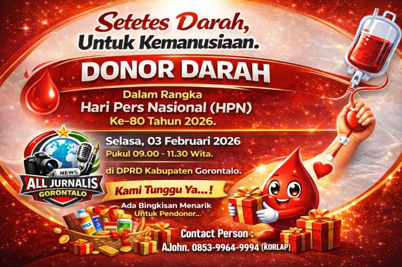 Tilangonews.com – Dalam rangka menyambut Hari Pers Nasional (HPN) ke-80 tahun 2026, komunitas All Jurnalis Gorontalo menggelar kegiatan donor darah sebagai bentuk kepedulian sosial dan komitmen insan pers terhadap nilai-nilai kemanusiaan.