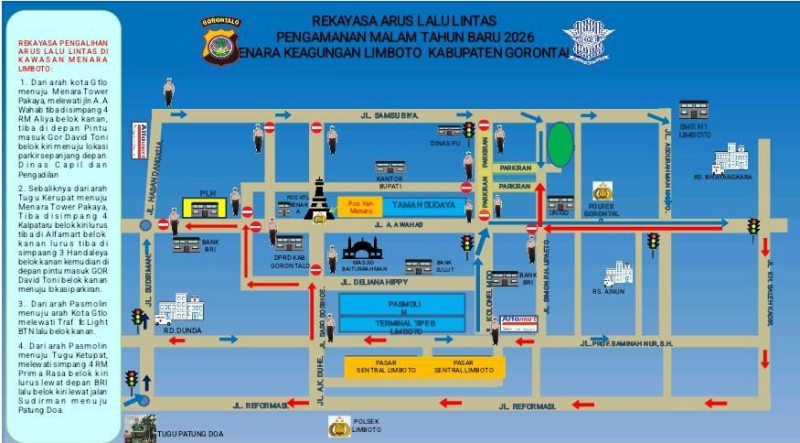Langkah ini dilakukan untuk mengantisipasi lonjakan kendaraan masyarakat yang diperkirakan akan memadati kawasan Menara Pakaya Tower Limboto, yang menjadi salah satu pusat keramaian perayaan malam tahun baru.