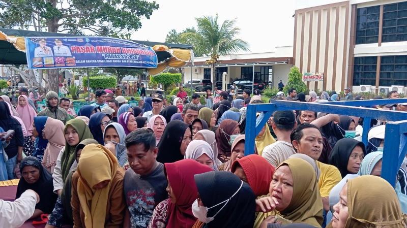 Program ini disambut antusias masyarakat yang rela mengantre sejak siang demi mendapatkan bahan pokok dengan harga terjangkau.