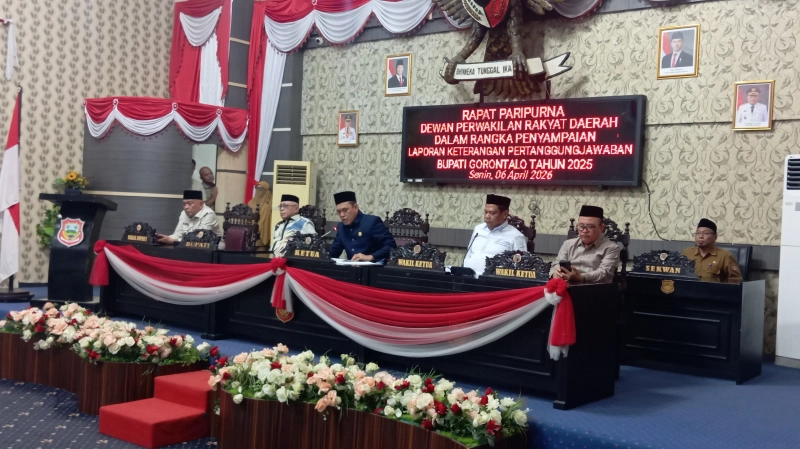 Tilangonews.com – Dewan Perwakilan Rakyat Daerah (DPRD) Kabupaten Gorontalo menggelar rapat paripurna dalam rangka penyampaian Laporan Keterangan Pertanggungjawaban (LKPJ) Bupati Gorontalo Tahun Anggaran 2025, Senin (6/4/2026).